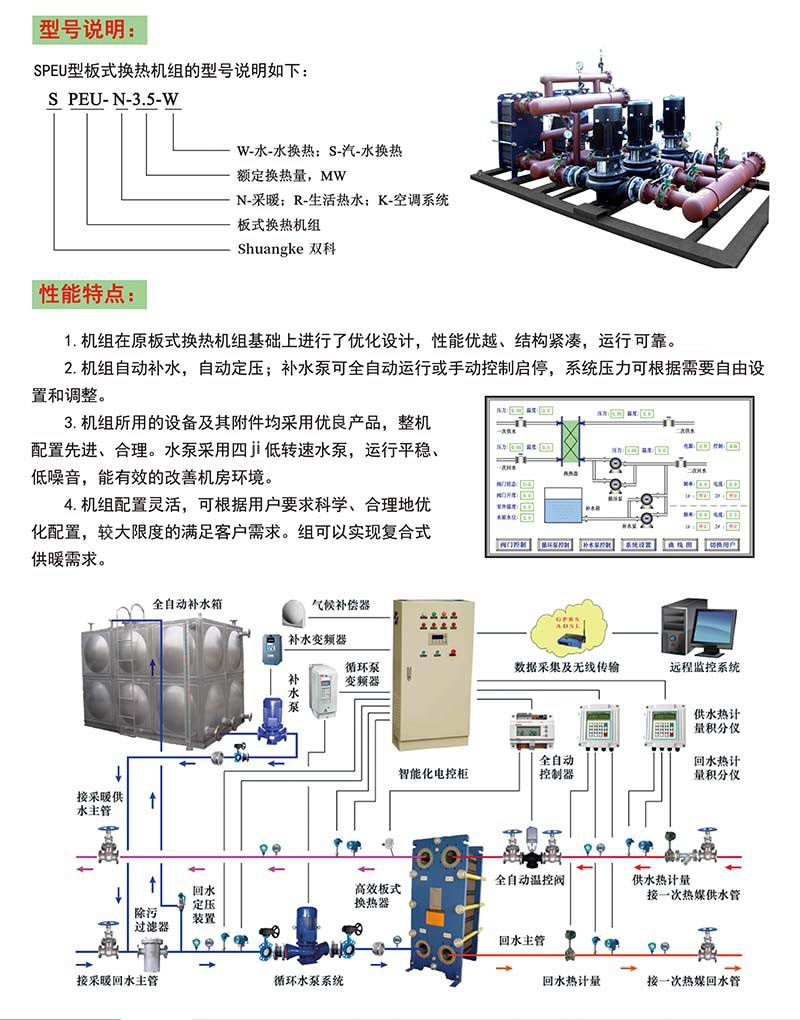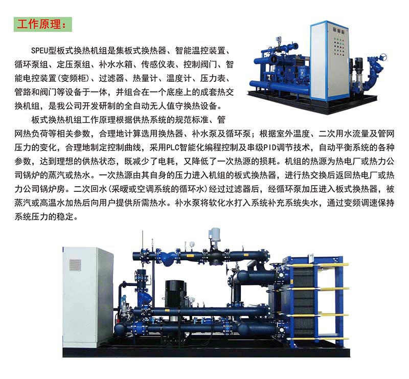 SPEU型板式換熱機(jī)組是我公司根據(jù)我國供熱行業(yè)發(fā)展趨勢,專門針對供暖區(qū)域來設(shè)計(jì)開發(fā)的有效型換熱機(jī)組,是集城市供熱技術(shù)、智能化控制技術(shù)與人性化結(jié)構(gòu)設(shè)計(jì)于一體的智能型熱交換機(jī)組,具有強(qiáng)大的功能來完成所有建筑物的各種區(qū)域熱能需求??蓮V泛適用于工廠、機(jī)關(guān)、學(xué)校、住宅小區(qū)、別墅等民用建筑;商場、賓館、飯店、度假村等商用建筑的采暖、空調(diào)、洗浴用水、生活用水、游泳池冬日用水。