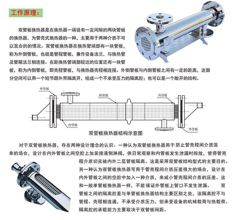 換熱器在各個領(lǐng)域應(yīng)用十分廣泛,是不可缺少的工藝設(shè)備之一,但在實際操作中換熱器的換熱管與管板連接處容易發(fā)生泄漏,使管程物料和殼程物料有少許的混合。在有些場合,少許的泄漏是允許的;而有些場合管程物料和殼程物料想混后會產(chǎn)生嚴(yán)重的后果。雙管板換熱器結(jié)構(gòu)由于具有能確保管殼程介質(zhì)完全分隔開、不能互相串通,無論管殼程哪段介質(zhì)泄漏即可迅速檢測出等優(yōu)點(diǎn),越來越受到介質(zhì)有高度危害且管殼程介質(zhì)嚴(yán)格不能互相混合的用戶的歡迎。